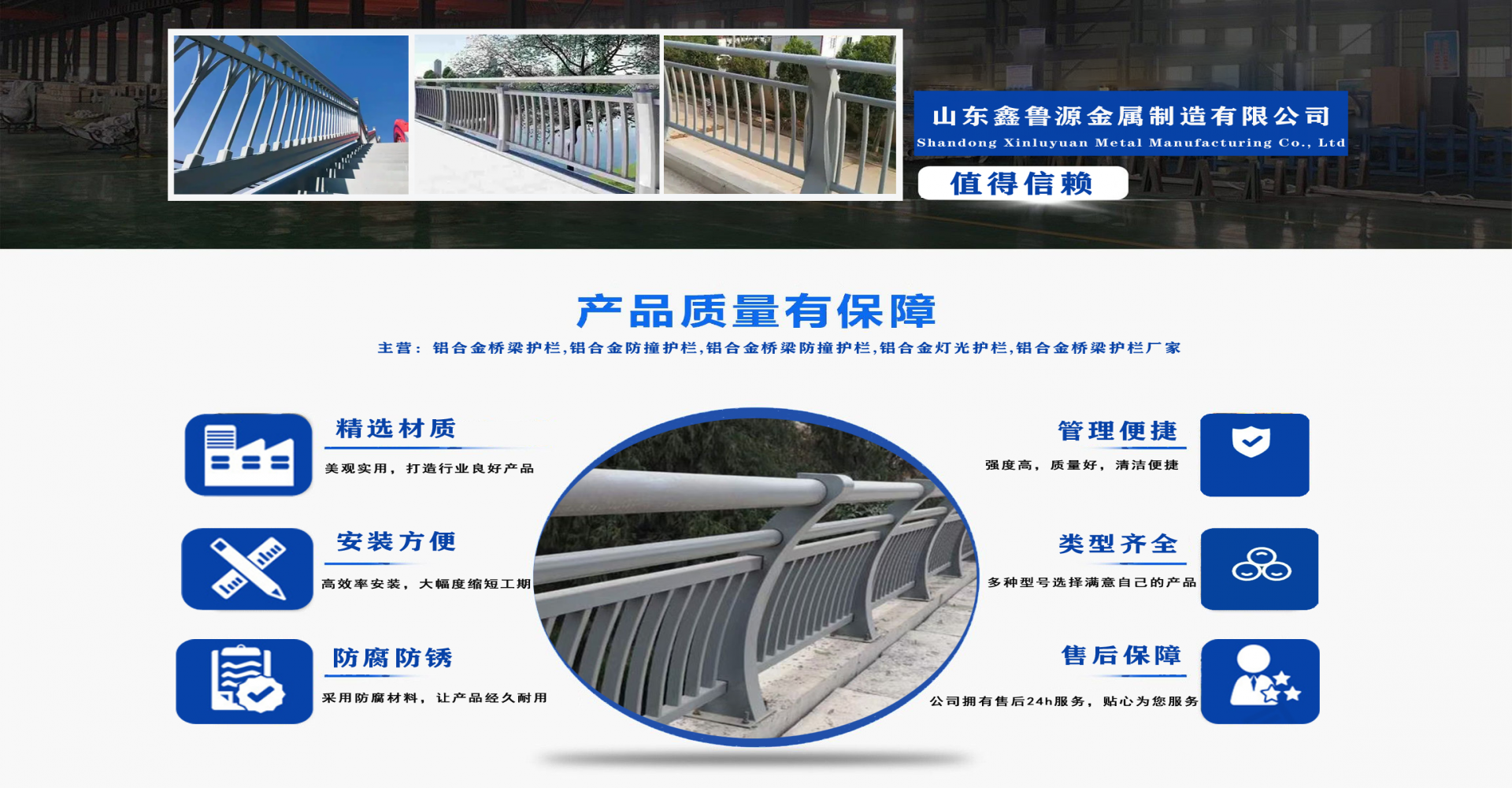 山東鑫魯源金屬制造有限公司主要經(jīng)營:鋁合金橋梁護欄,鋁合金防撞護欄,鋁合金橋梁防撞護欄,鋁合金燈光護欄,不鋁合金橋梁護欄廠家,環(huán)波梁橋梁護欄,環(huán)波梁防撞護欄。質(zhì)量可靠、經(jīng)濟實用的顯著特點。公司為客戶提供可靠售后保障,堅持“以品質(zhì)立足、服務(wù)求發(fā)展”,愿與各界朋友精誠合作、攜手發(fā)展! 服務(wù)優(yōu)勢:真誠的服務(wù)理念、完善的服務(wù)體系。公司專業(yè)力量充足;工程案例眾多、從業(yè)經(jīng)驗豐富;公司以可靠質(zhì)量的產(chǎn)品,合理的價格,完善的售后服務(wù),能夠滿足市場各個企業(yè)的需求?! ∑髽I(yè)精神:執(zhí)著追求 持續(xù)創(chuàng)新執(zhí)著追求,就是堅持不懈、堅定從容,專注于自己的事業(yè),把能做的事情做好,不斷克服困難、把握機遇,贏得未來?! 〕掷m(xù)創(chuàng)新,就是生命不息、創(chuàng)新不止,通過持續(xù)實施技術(shù)創(chuàng)新、管理創(chuàng)新、市場創(chuàng)新,獲取持續(xù)的競爭優(yōu)勢。...
